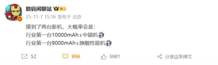 10月发布的这批旗舰手机和中端手机,虽然电池对比上代都提升了,但并没有超越行业天花板,接下来的手机才会不断打破记录,不仅会有很多8000mAh的手机,还会有9000mAh、10000mAh的手机出现,对续航很在意的用户一定要等等。