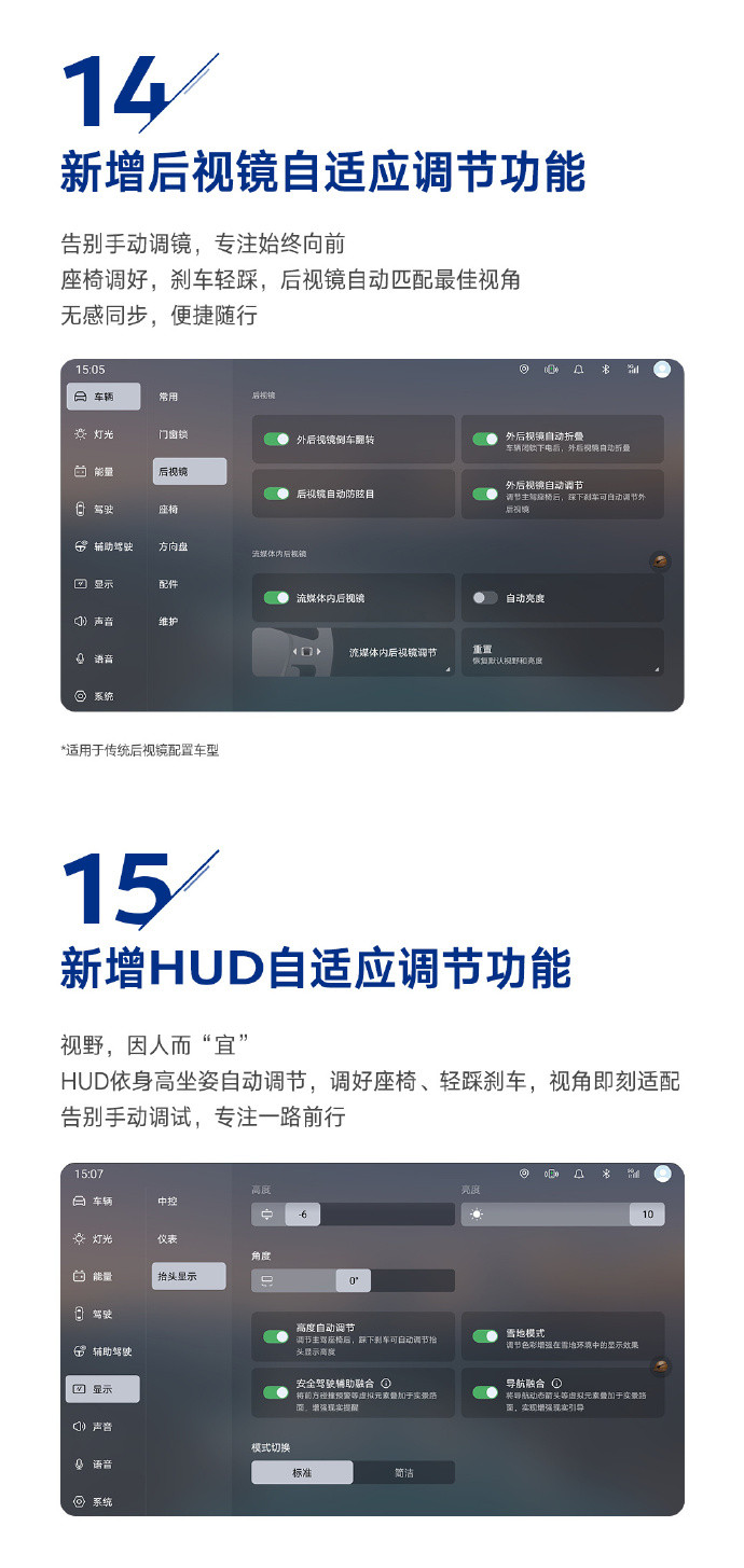 新增后视镜自适应调节功能